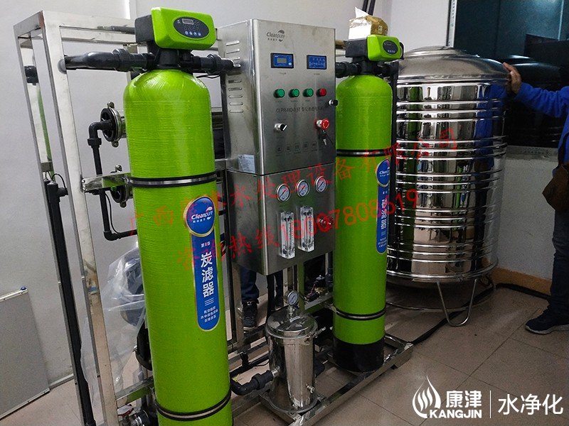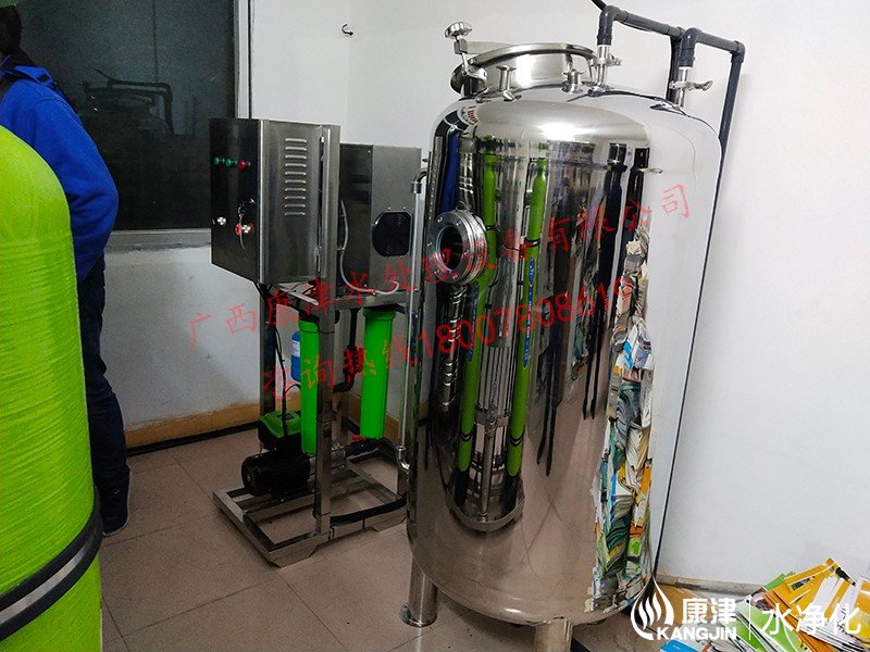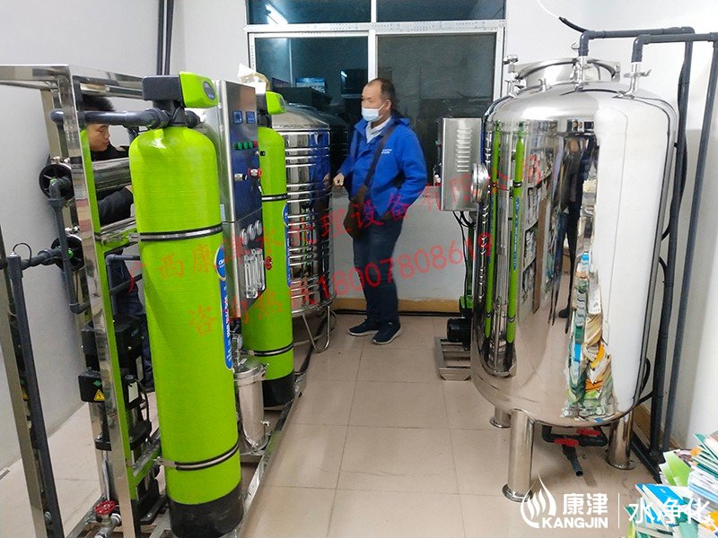 项目名称:来宾市北五小学直饮水设备工程 设备名称:0.5吨反渗透纯水设备 工艺流程:原水箱-原水泵-石英砂过滤器-活性炭过滤器-精密过滤器-臭氧杀菌-高压泵-反渗透膜组-无菌水箱-变频回水系统
